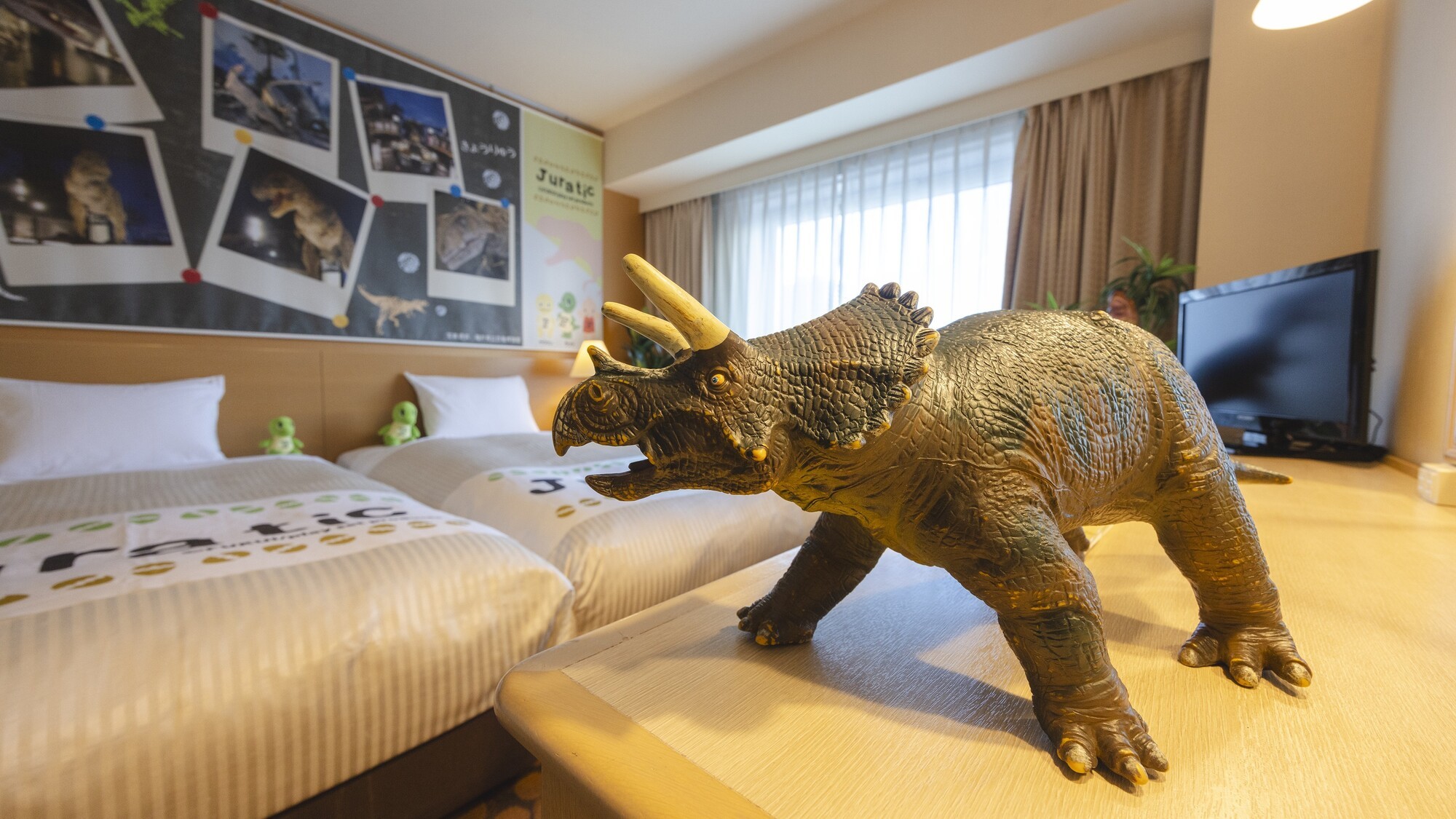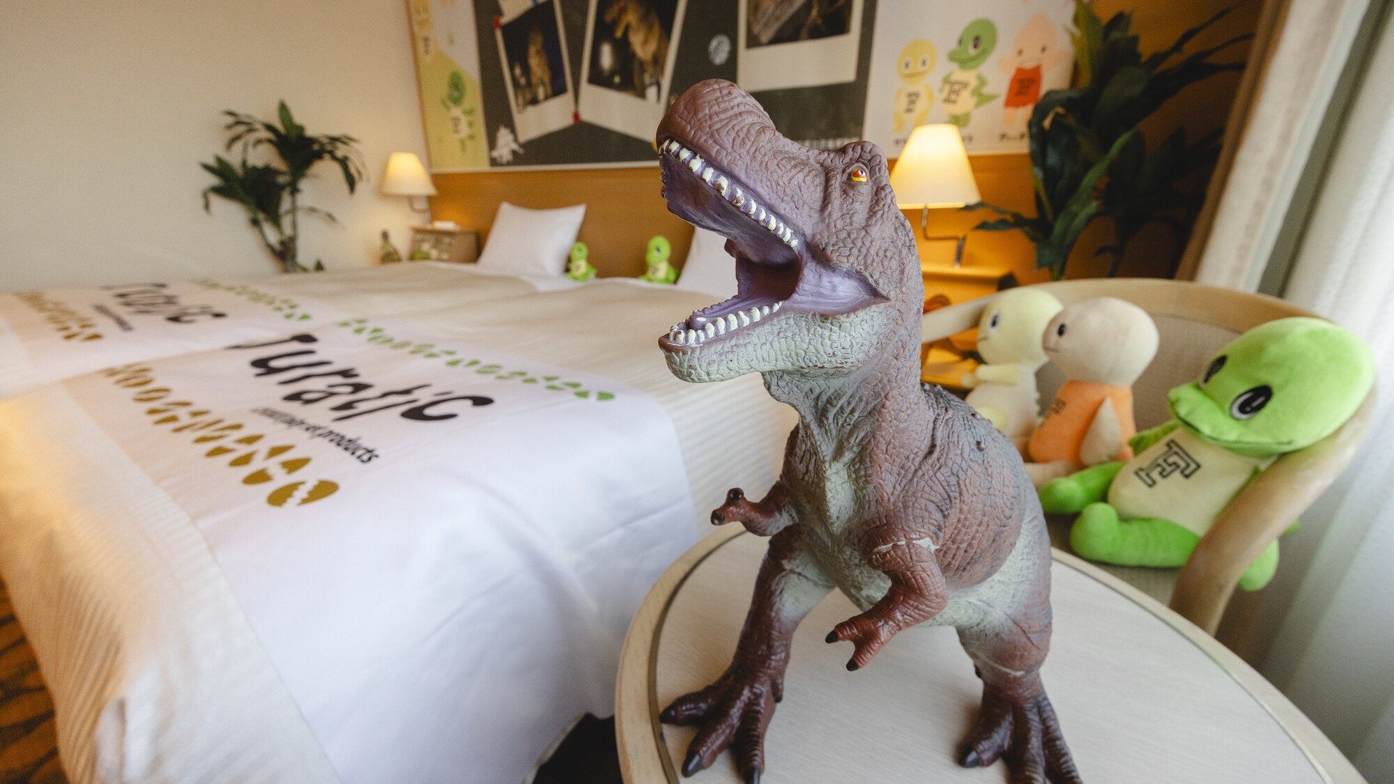 ジュラチックルームは壁一面の恐竜やぬいぐるみたちに囲まれたお部屋です。