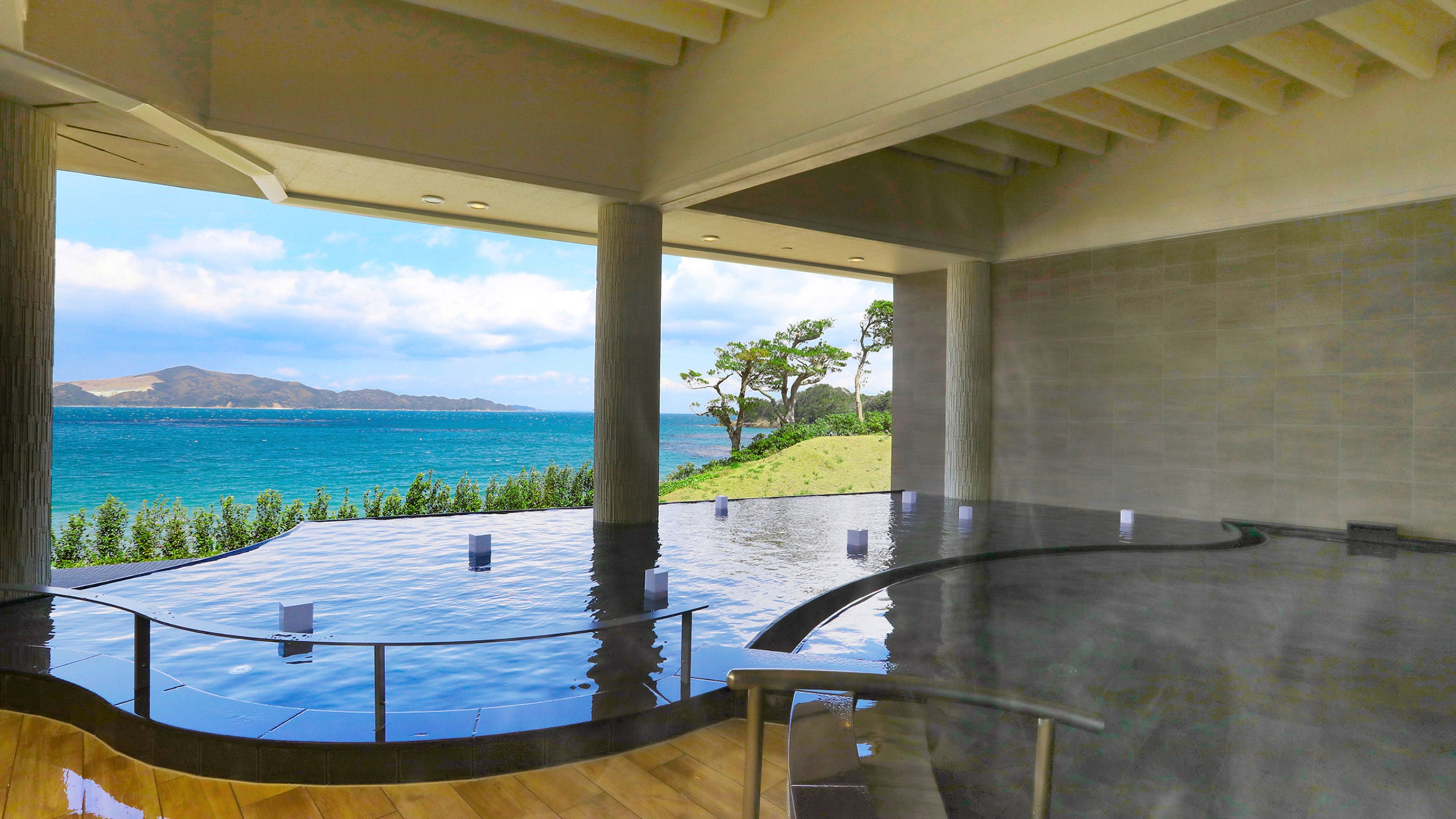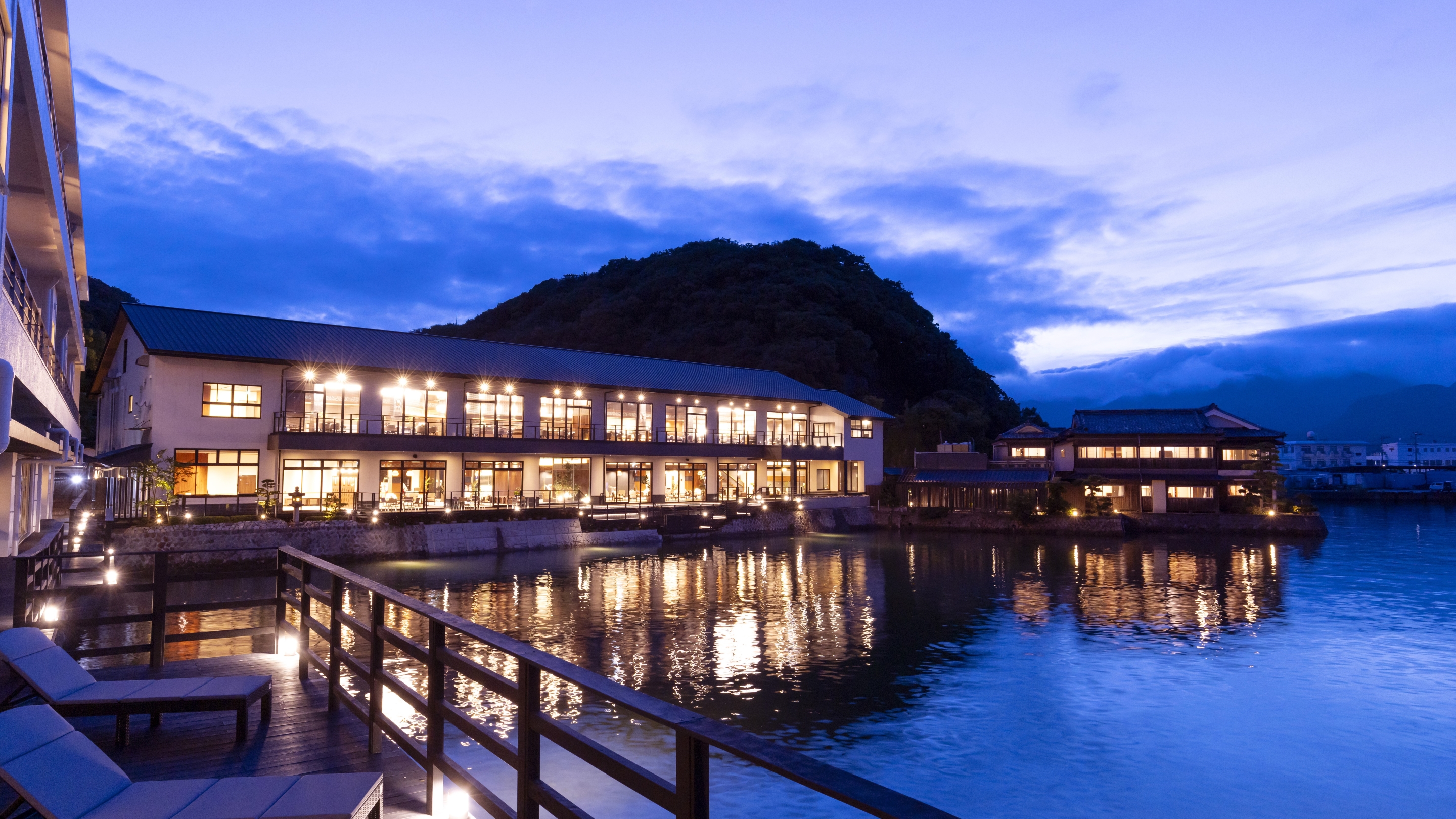 夕陽百選のロケーションを望むインフィニティ露天風呂を楽しむことができるお宿です。