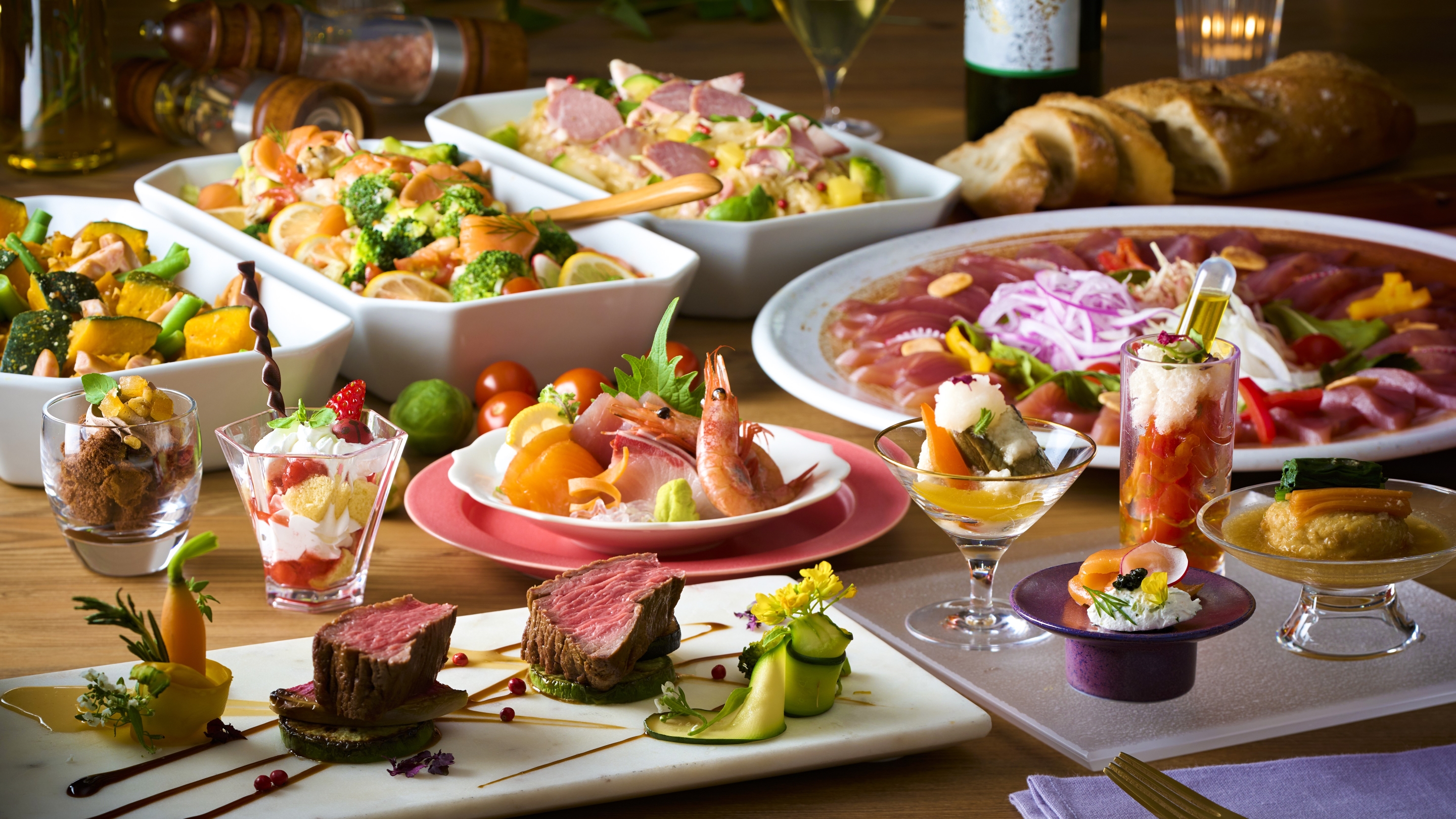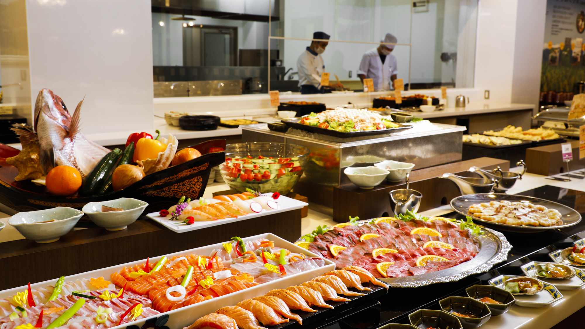 夕食バイキングでは、市場直送の天然本まぐろや真鯛、海鮮浜蒸しに加え、ハーゲンダッツなどを楽しめます!