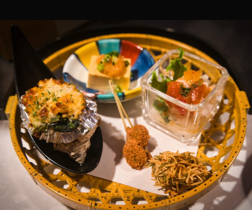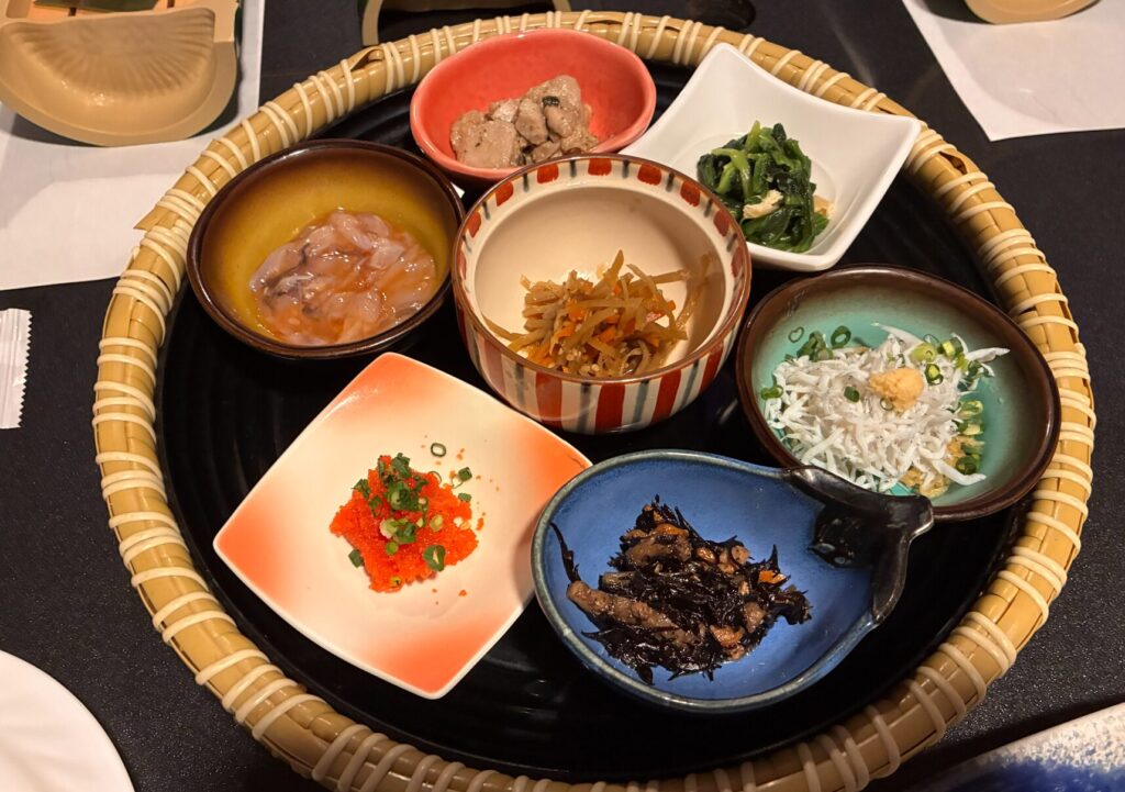 前菜盛り合わせはこちらです。伊勢海老の栗真薯やあん肝豆腐など箸が進みます。