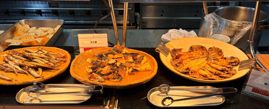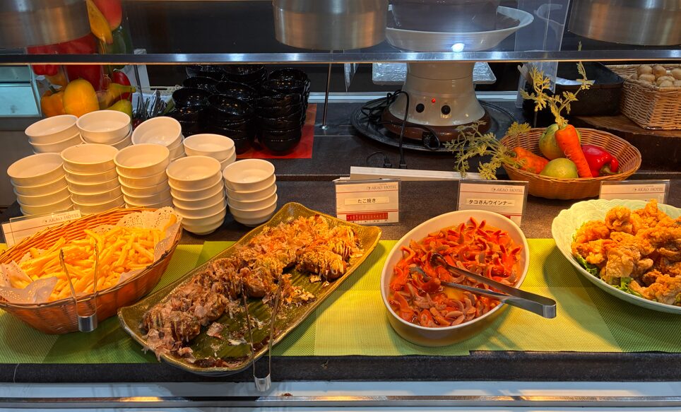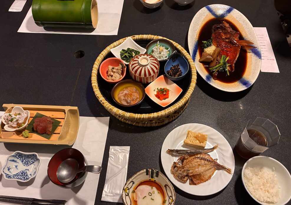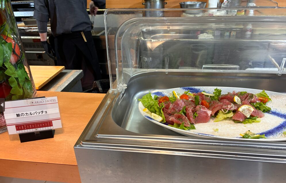 稲取赤尾ホテルではあらかじめ配膳されている食事に加え、ハーフブッフェで好きな食事を食べることができました。