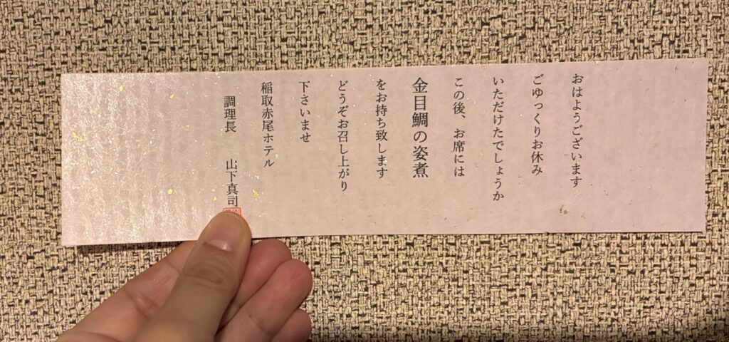 よくよくテーブルを見ると「この後お席に金目の姿煮をお持ちします」とのメッセージが書いてありました。