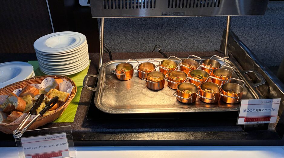 きのこと海鮮のアヒージョ&ガーリックバターバケットは、おいしい匂いがしてきたのですが、お腹いっぱいで断念。