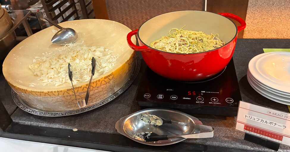 スタッフさんがその場で削るチーズは鮮度抜群です。なによりパスタのトリュフの香りが高くて、このパスタが食べ放題ってやばくない?と夫と盛り上がりました。