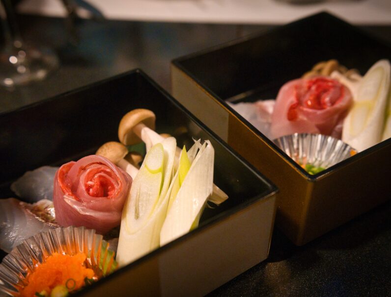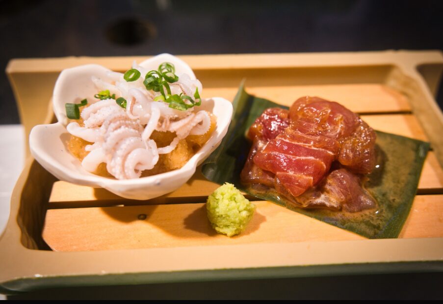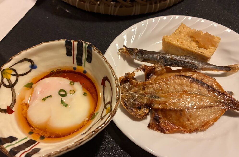 竹をモチーフにした入れ物を開けると、たこの大根おろし和え、まぐろもありました。(朝食に海鮮が出るのってすごくないですか?)