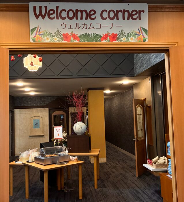ウェルカムサービスはチェックインカウンターのすぐ横で実施されていました。