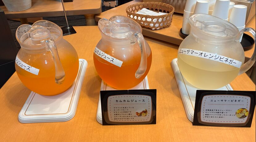 ニューサマーオレンジビネガー、カムカムジュース、オレンジジュースが飲み放題です。