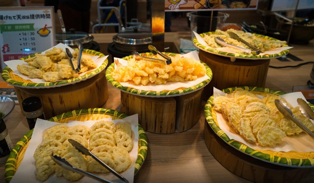天ぷら、麺類、サラダ