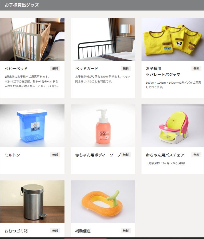 ミルトンや赤ちゃん用ボディーソープ、子ども用セパレートバジャマなの貸し出しは荷物を減らせるので助かりますよね。