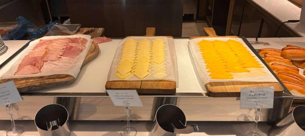 チーズ2種類やハムもありました。ホットドックにお好みで挟むことができましたよ。