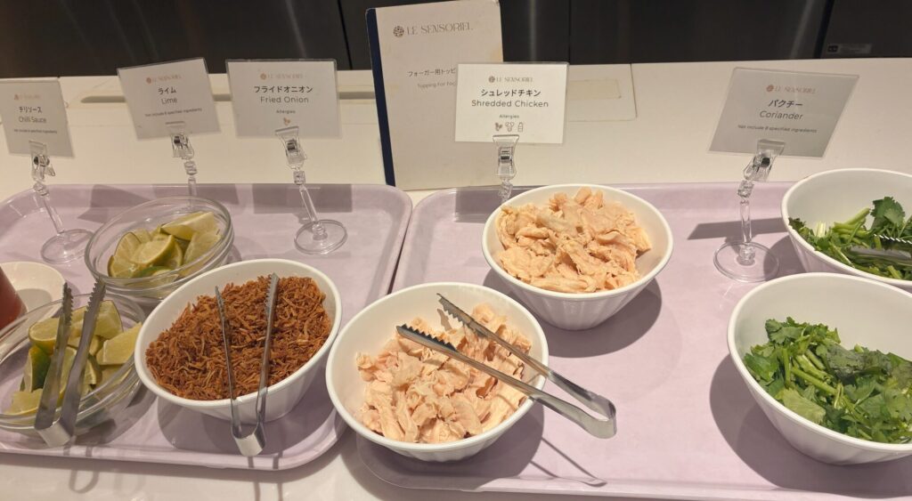 トッピングもたくさん用意されていて、パクチーやチキン、ライムなど充実しています。