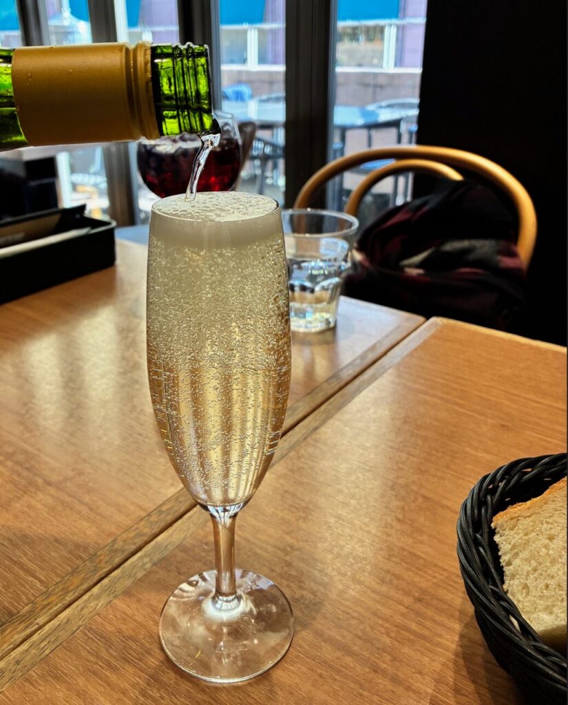 メニュー表をみるとアルコールもワンコインだったので、シャンパンを注文しました。