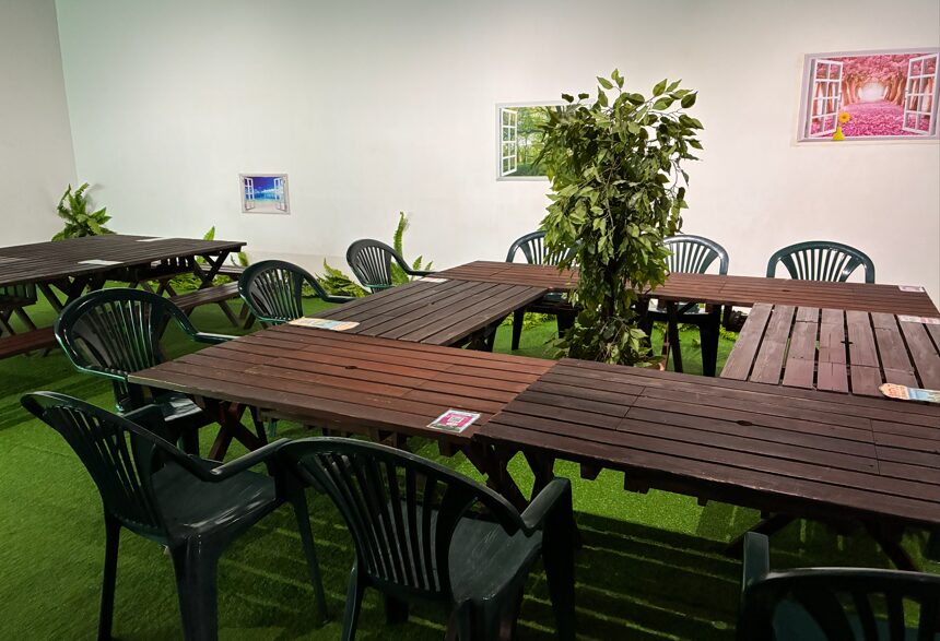 無料休憩所は椅子と机が置いてあるスペースなのですが、冷暖房完備です!