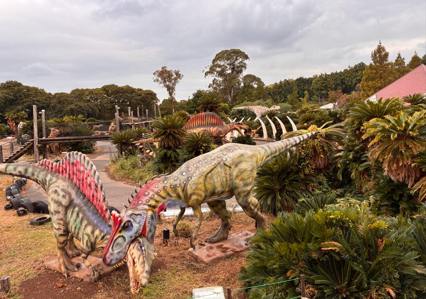外側はゴーカートのレーンになっていますが、散歩エリアは無料なので写真を撮りながら恐竜を見ることができます。