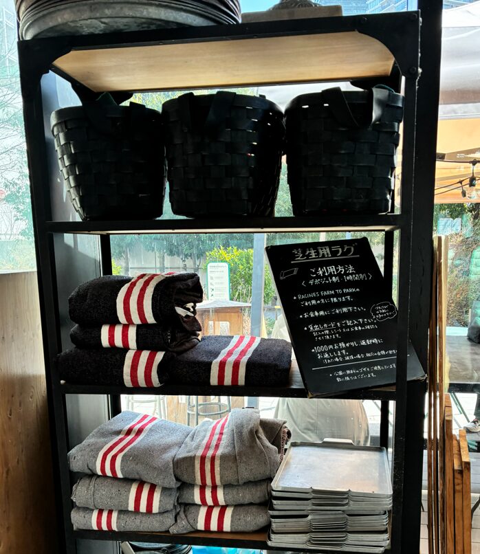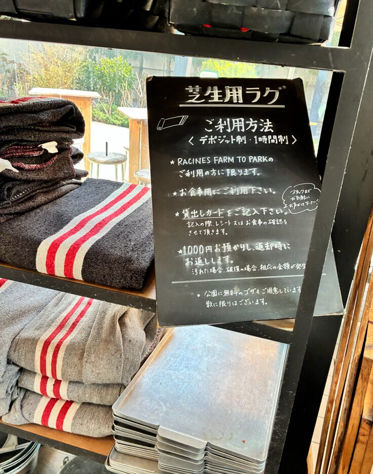 カフェで芝生用のラグの貸し出しを行っていました。1時間無料で使うことができます。