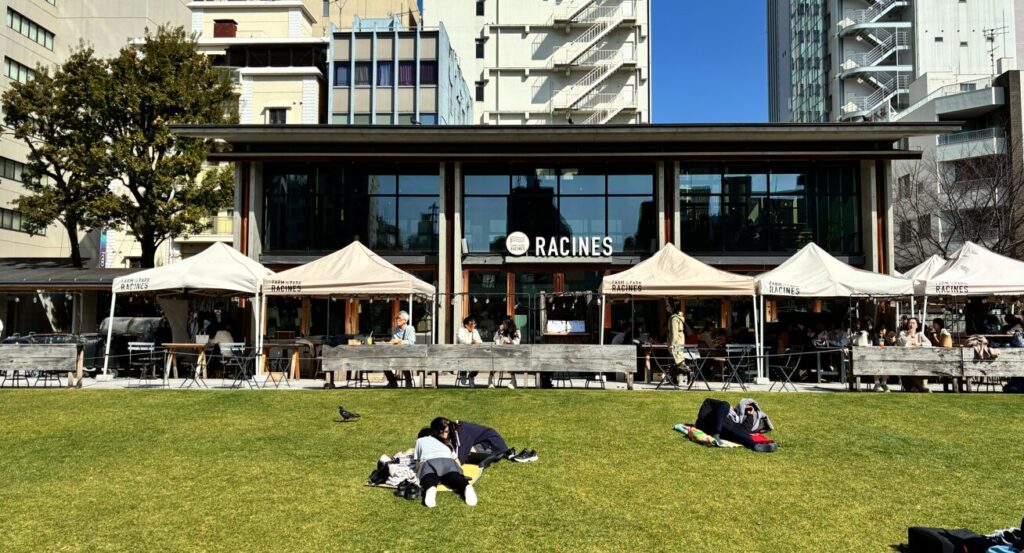 芝生の横にカフェが併設されており、テイクアウトしたメニューでピクニックを楽しめます。