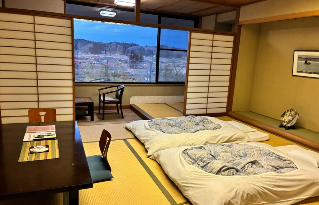 お部屋の様子も紹介します。窓から厳美渓を見ることができる絶景は贅沢でした。