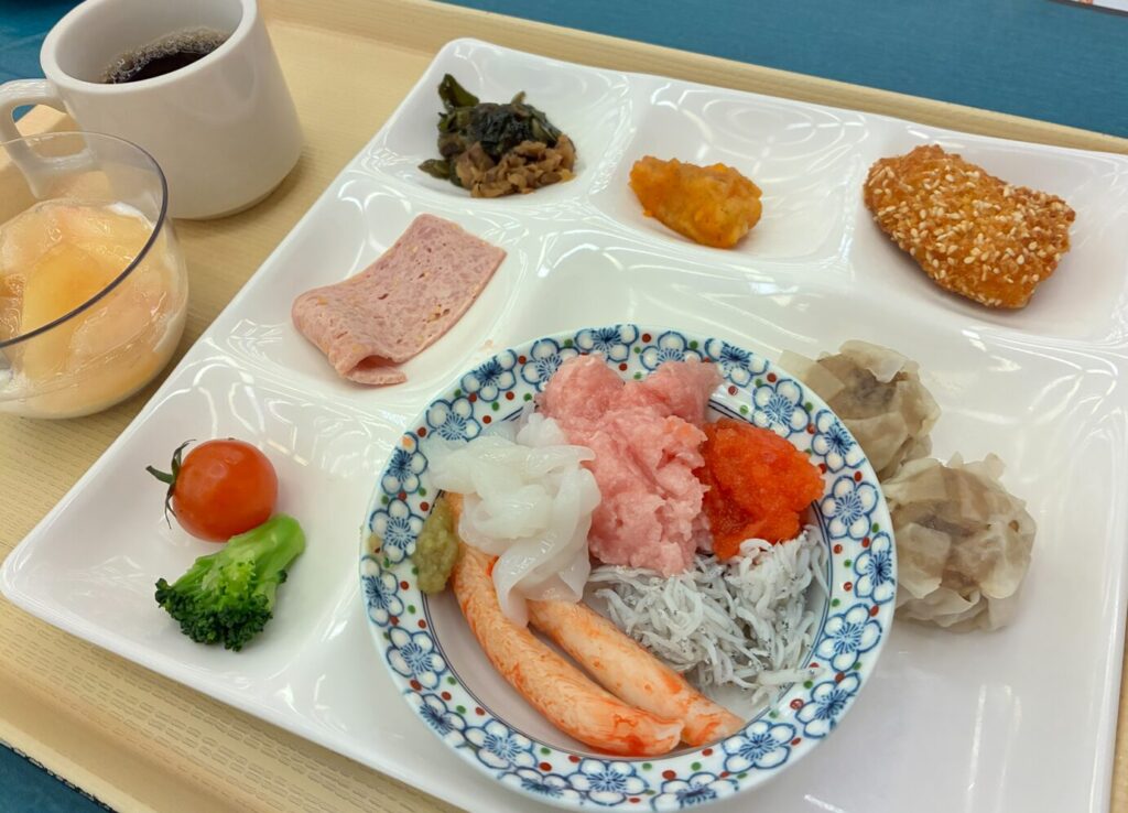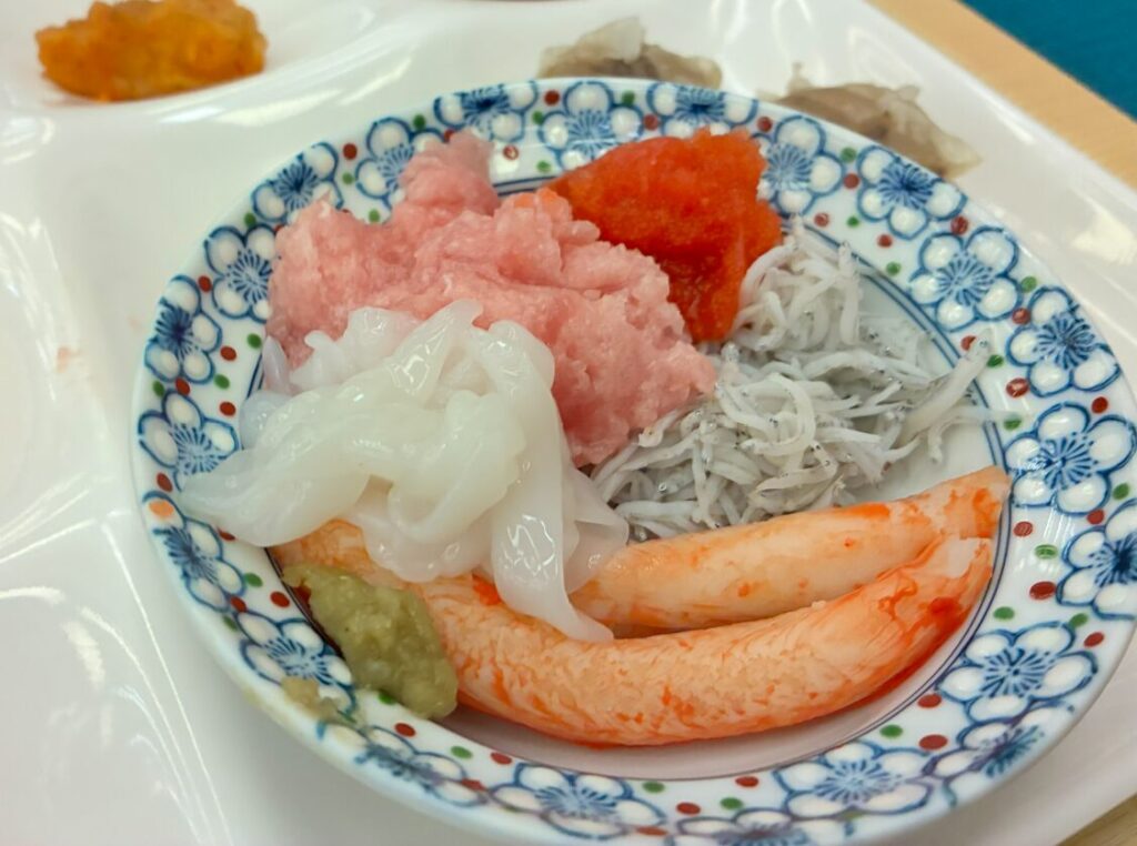 マグロのたたきやいかそうめん、しらす、辛子明太子などの海鮮があったので、セルフ海鮮丼を作ることができました!