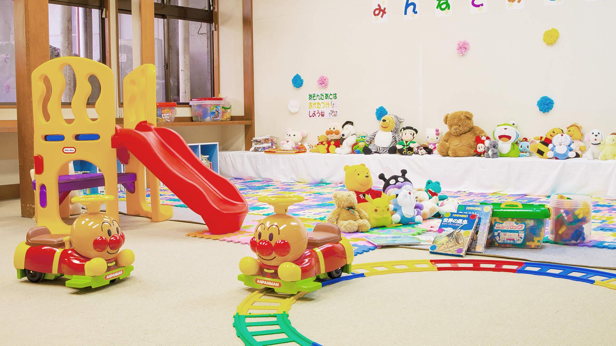 キッズスペースは滑り台から絵本やぬいぐるみまで幅広く揃えられていますよ。