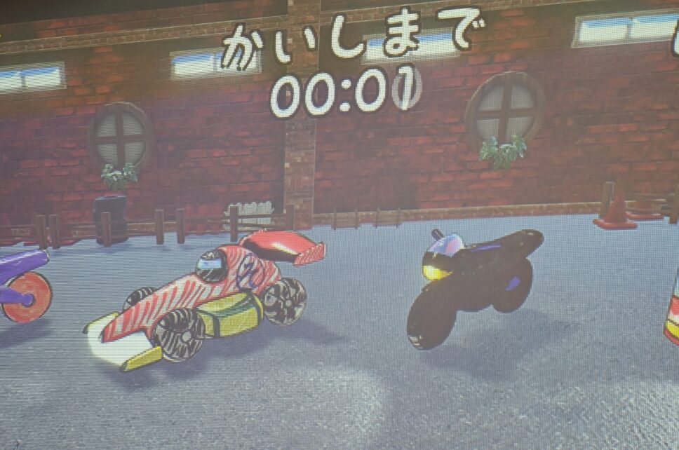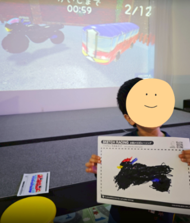 塗り絵をスキャンするとその絵が立体的に浮き上がり、大画面の中でレースをするという仕組みで競争できます。