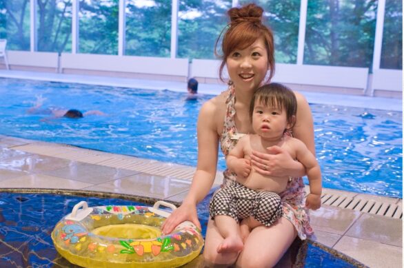 我が家は、3歳の長男とプールで遊び、プールサイドで0歳次男をパパママが交代で抱っこしていました。