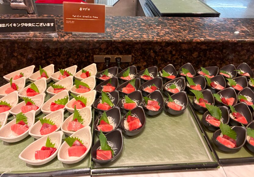 ビュッフェが終わる45分くらい前(20:15頃)だと本日分の中トロが終わっちゃったみたいです。本マグロは早めにとることをおすすめします!