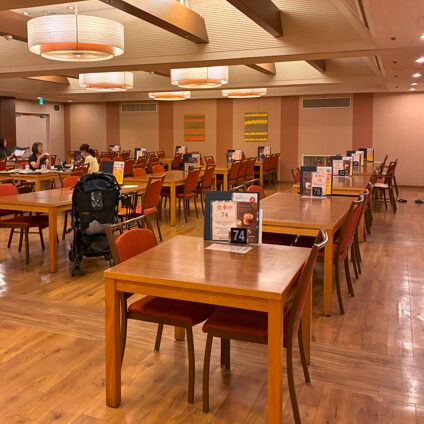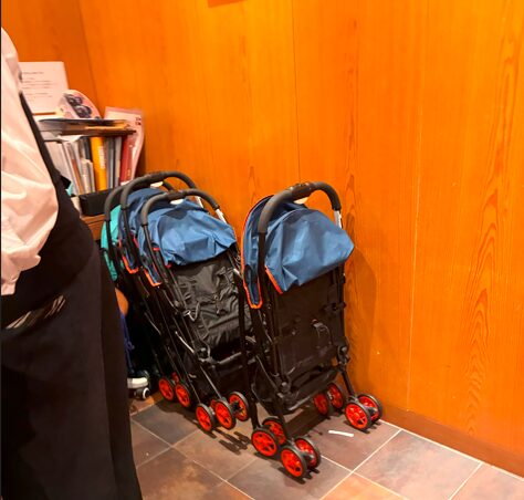 我が家はA型ベビーカーを持参したのでテーブルに横付けしましたが、貸出のベビーカーを利用しているしているファミリーも複数見かけました。