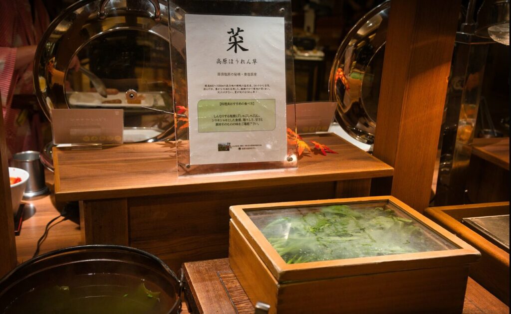 高原ほうれん草のしゃぶしゃぶもありました。だし昆布の効いたお鍋でさっとしゃぶしゃぶすると瑞々しいほうれん草を食べることができます。