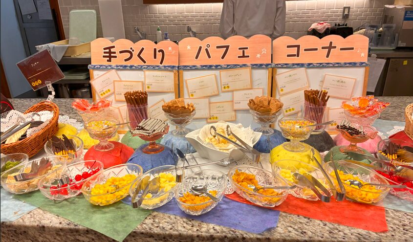 意外と良かったのが、手作りパフェコーナーです。息子が楽しそうにサクランボやポッキーなどのトッピングを選んでのせていました。子どもが喜ぶメニューですよね。