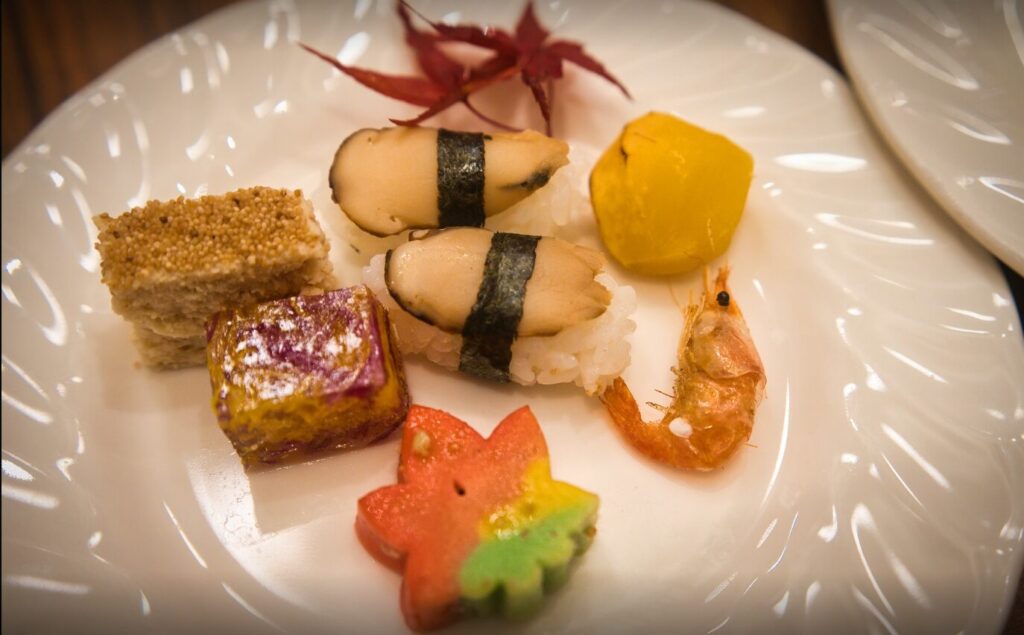 秋のシーズンメニューもあり、松茸のお寿司(写真の左下)や、栗(写真の真ん中奥)など見た目も楽しめる工夫がされていましたよ。