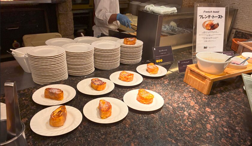 24時間つけたというフレンチトーストは、ヒタヒタふわふわでホテルビュッフェらしいお味でした。ブルーベリーソースをかけて、甘い幸せを食べました!