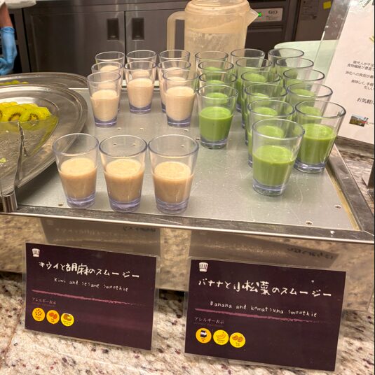 キウイと胡麻のスムージーは胡麻の味がしっかりしていますがキウイの甘酸っぱさで飲みやすく仕上がっていました。バナナと小松菜のスムージーは、小松菜の苦みを感じつつもバナナの甘さでマイルドに飲みやすくなっていました。