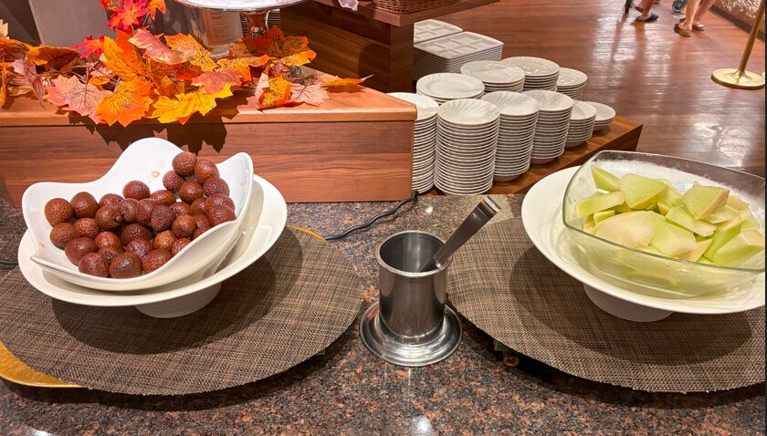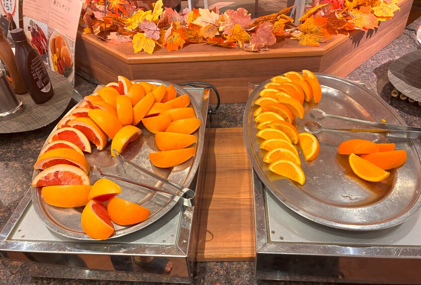 デザートコーナーには先ほどの朝どらやきに加えて、ライチやメロン、オレンジなどがありました。