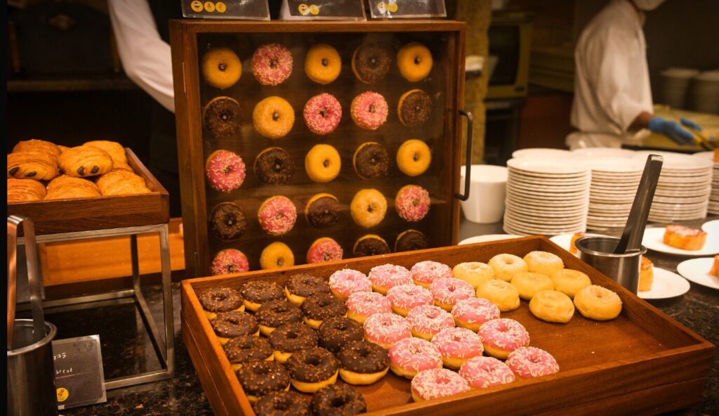 パンコーナーには映え抜群のドーナッツやフレンチトーストがありました。