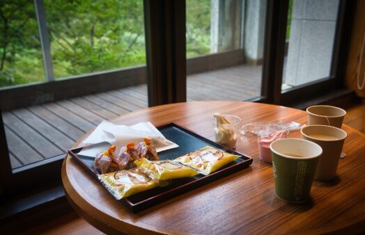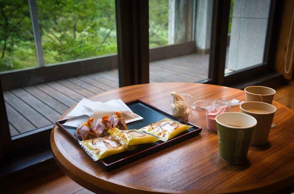 このウェルカムスイーツは、鬼怒川を臨む渓流沿いのロビーで、お菓子とドリンクをいただくことができますよ。