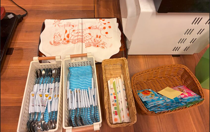 カラトリー類は、フォークとスプーン、子ども用の割り箸があり、さらに使い捨て紙エプロンや子ども用アンパンマンふりかけもありました。