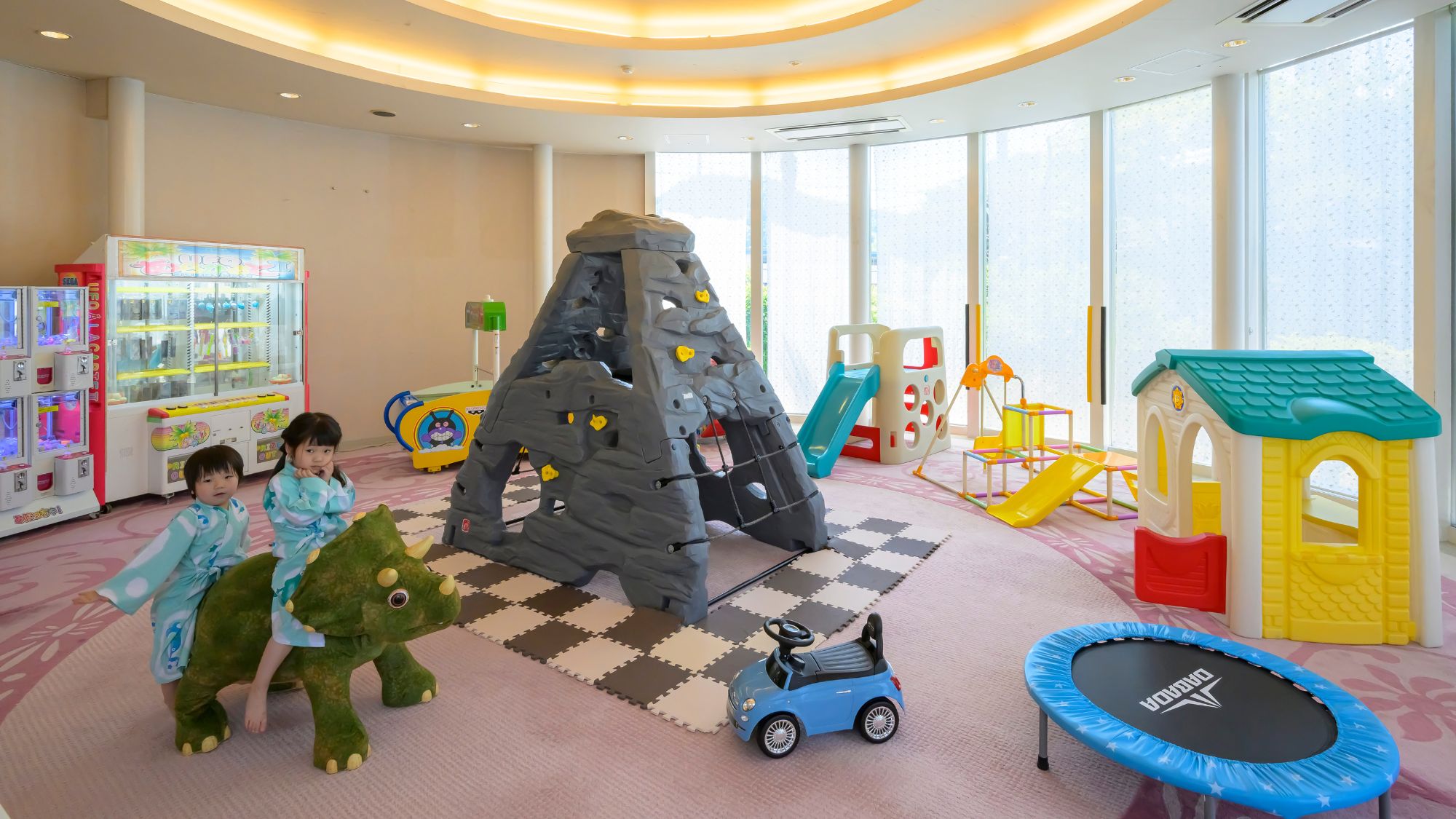 キッズコーナーは広く、動く恐竜に乗って遊ぶこともできましたよ。