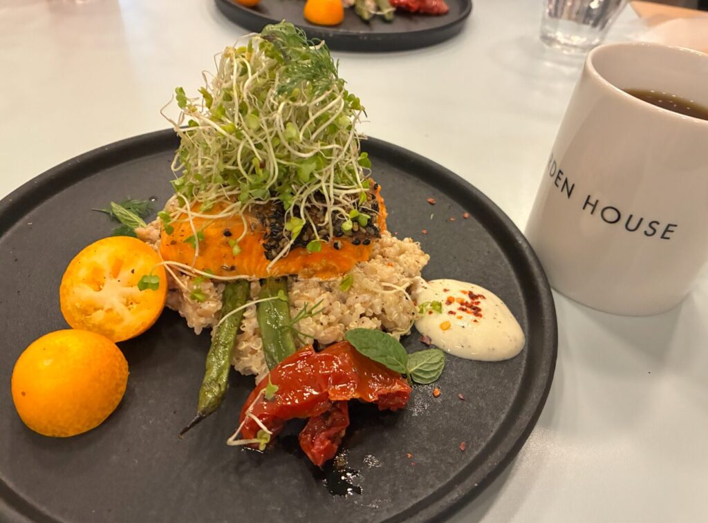 サーモンに黒ゴマをふり、香ばしく焼かれたサーモンの下にキヌアが敷かれていました。