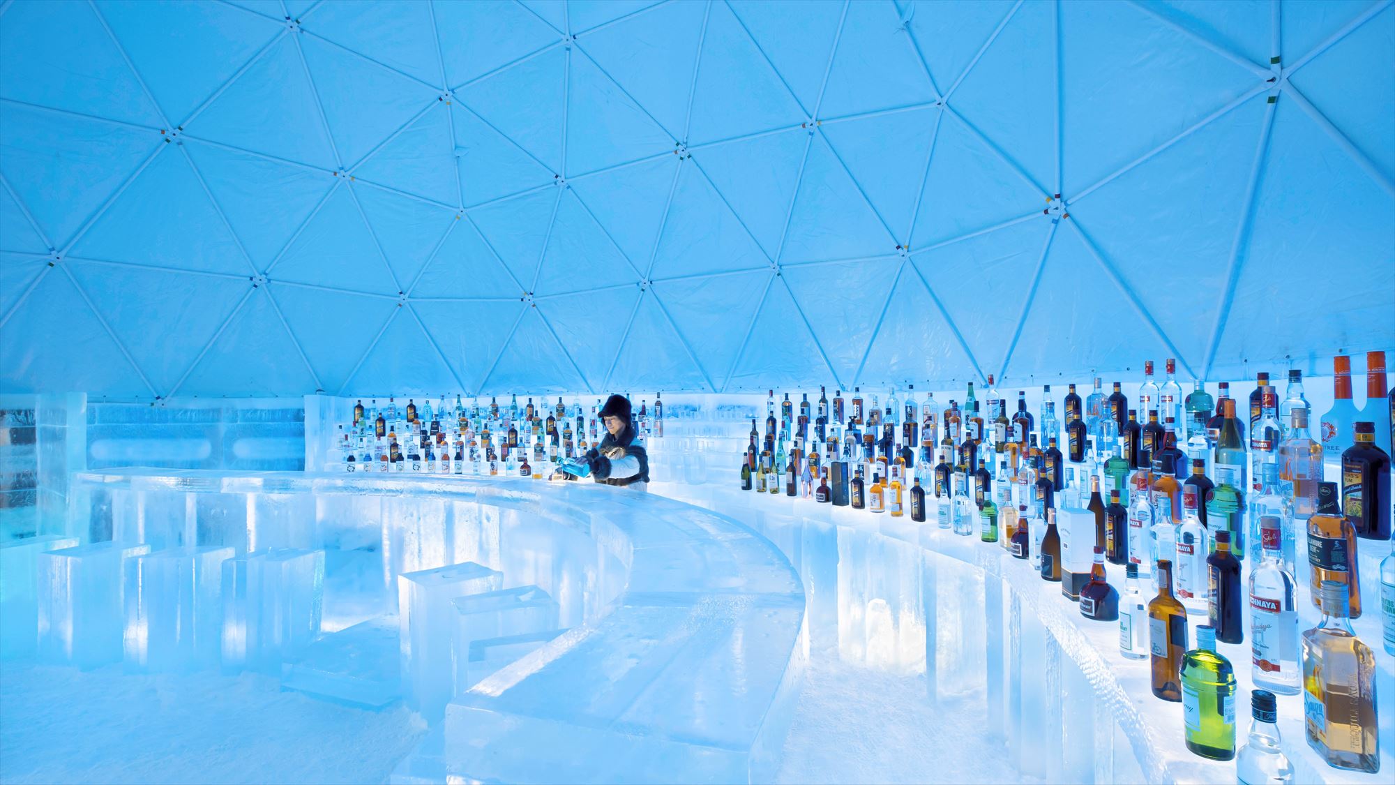 氷のBarもあります。氷のカウンターに氷のグラスと、氷尽くし!