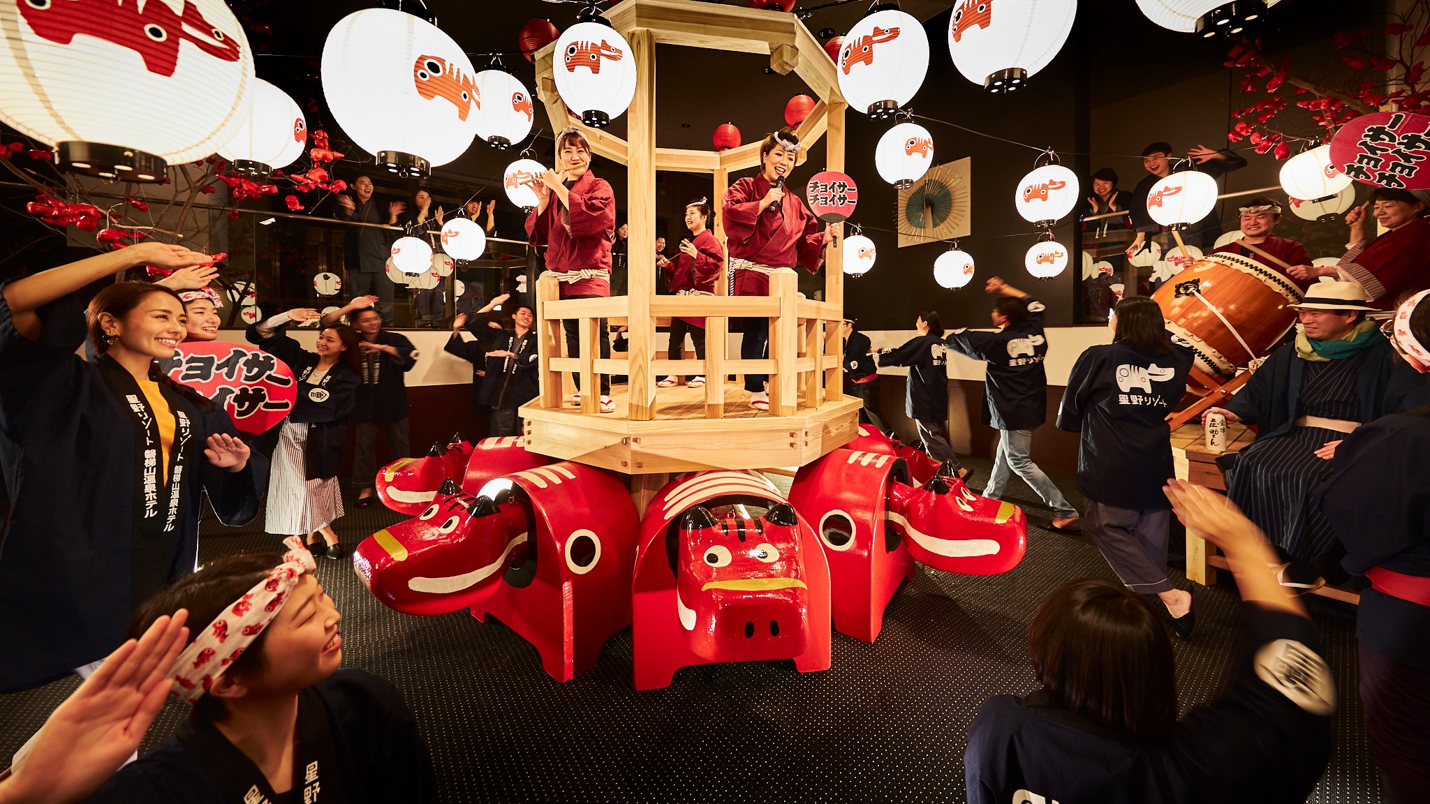 赤べこづくしの空間で民謡を聞きながら、踊りに参加することができます!