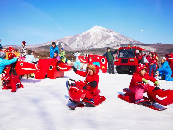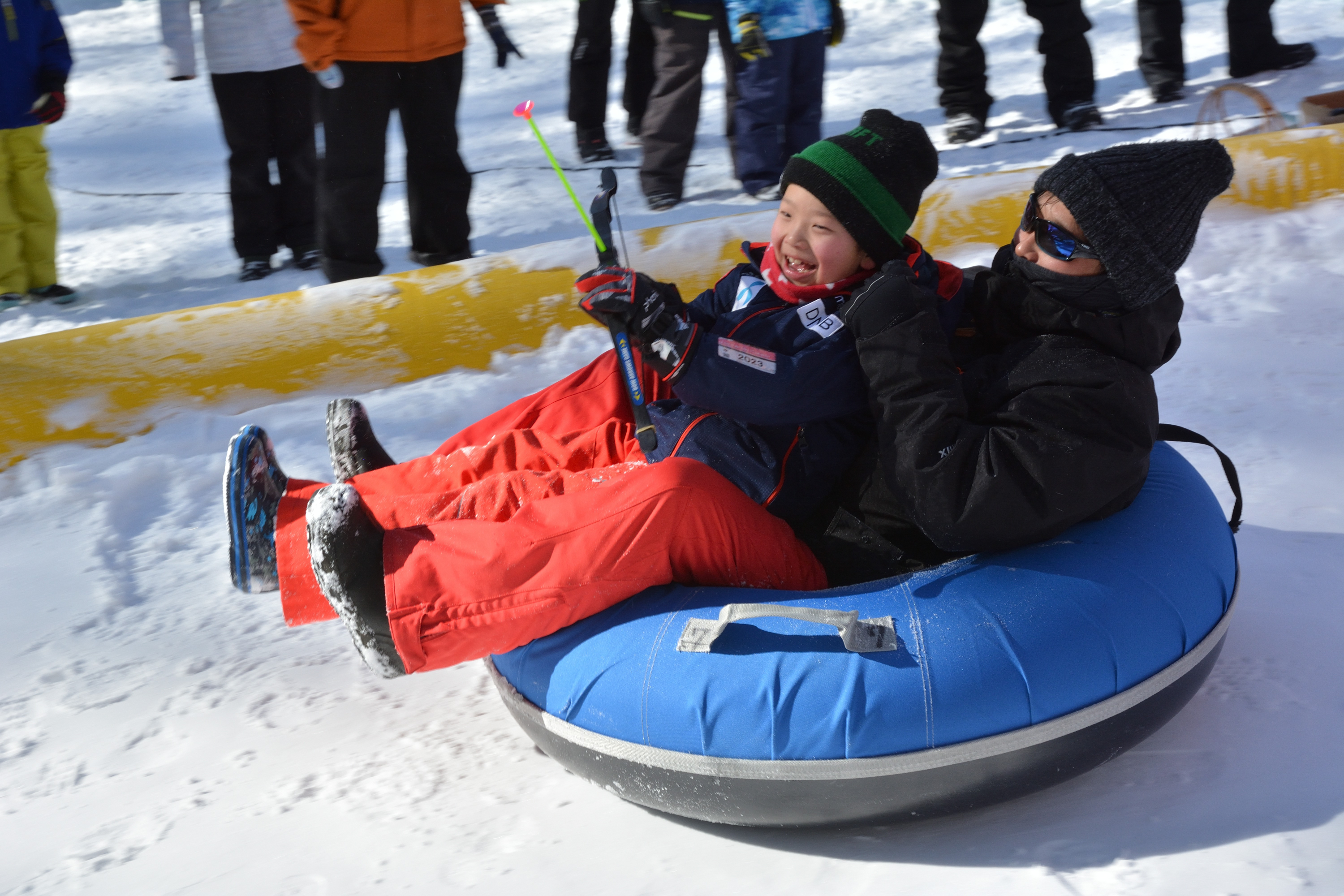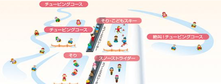 ゲレンデにはスノープレイランドがあり、子どもと一緒に種類様々なソリで遊ぶことができます。