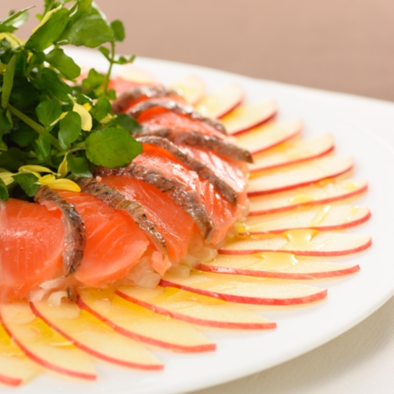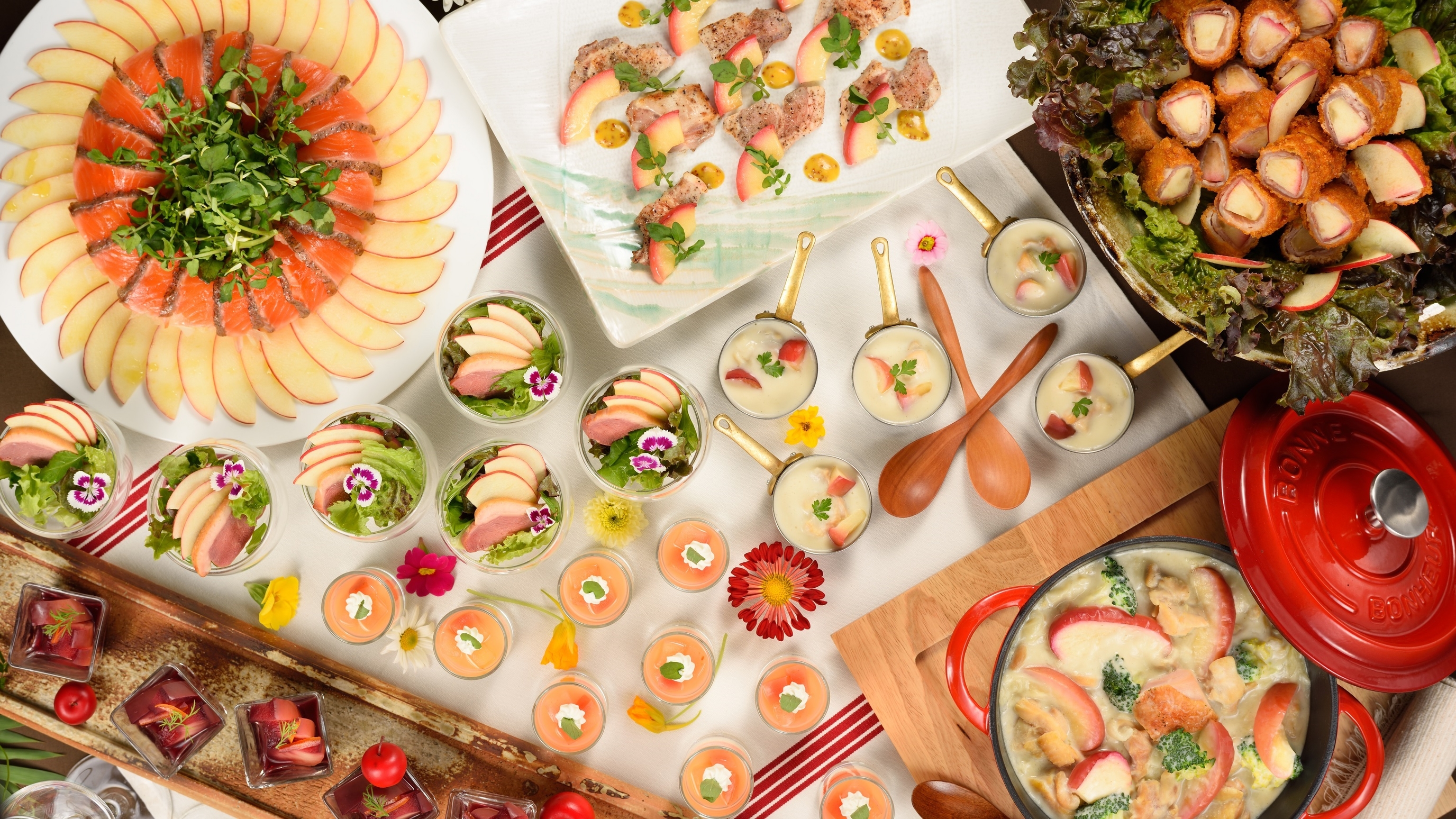 炙りサーモンマリネりんごソースやりんごとポークのソテーなど、これでもかとりんごを味わうことができます。