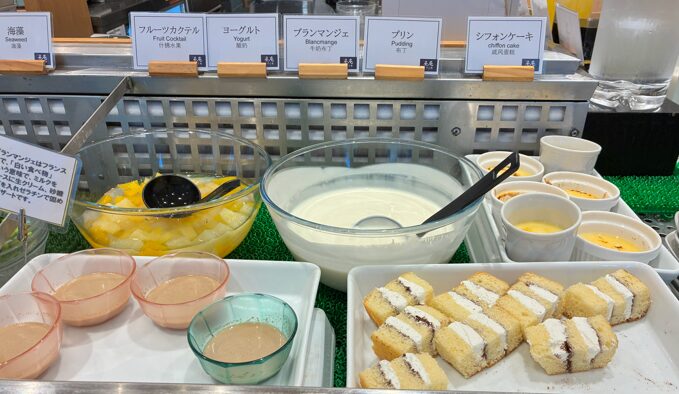 デザートは、シフォンケーキやプリン、ヨーグルト、フルーツカクテルがありました。